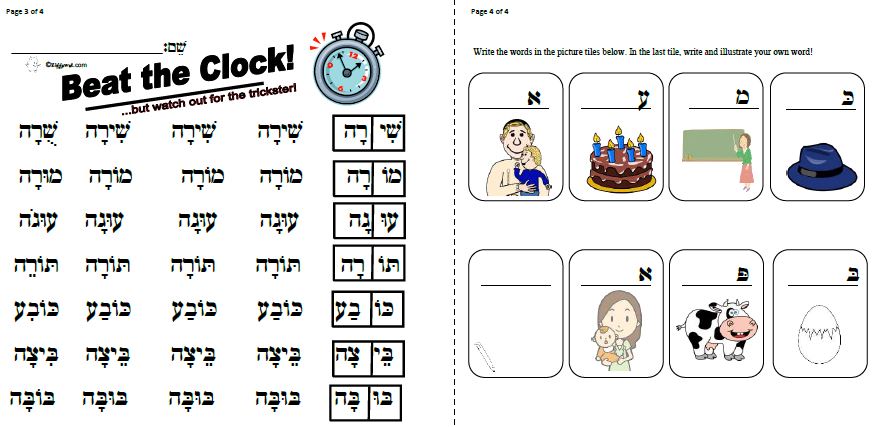 In this 37 page file, the student has to read as they leap from word to word, but look carefully! The words may look the same but there is one different in each row. The repetitive pattern has the child pick up speed while the trick word demands constant focus on the details. With pages for each nekudah, there is lots of opportunity for practice. By the time your child is done he/she is sure to be an expert!