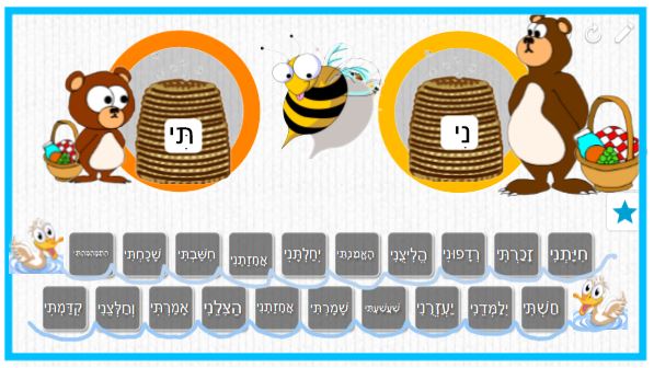 In this fun SMARTboard game, players find word ending patterns and sort accordingly, helping the bees fill their hives. Similar to practicing “word families,” this exercise helps encourage chunking, and thus fluency as well as teach Hebrew grammar.