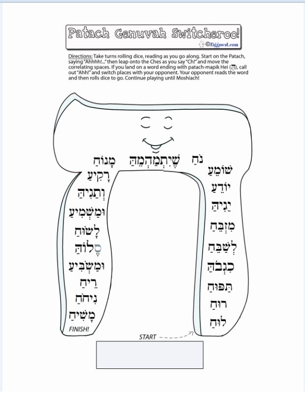 Typically when a letter is under a nekudah, we read “top to bottom”, pronouncing the letter first and then the nekudah. However, at the end of a word, a Patach is pronounced first when under a Ches or under a Mapik Hei (e.g. נֺחַ is pronounced “No-ach” not “No-cha'”.) Practice reading words with the “Patach Genuvah Switcharoo game.” For quick drill there is an indexed size “Learning Ladder” card and a full page “Chant Card” which is great for classroom review.